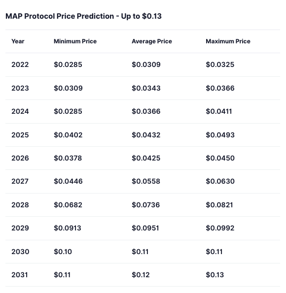 코인 관련 예측 가격을 안내하고 있는 digitalcoinprice.com에서는 올해 맵프로토콜의 가격을 $0.0285 ~ $0.0325 로 예측하고 있습니다.(현재 가격 $0.0233)