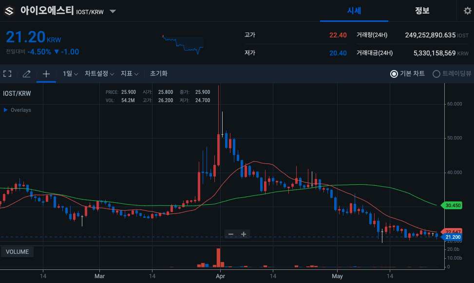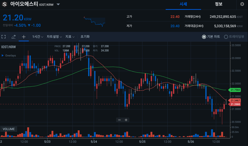 시세는 현재 21원대 초반에 형성되어있습니다. 불장때 하루 50%씩 급등하였던 것과 비교해보면 정말 시세가 많이 떨어진 수준인건데요.