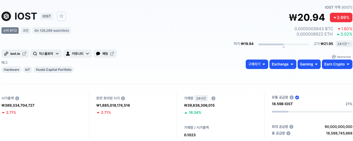 아이오에스티 코인의 총 발행한도는 90,000,000,000 개 이며 현재 시장에서는 21%가 유통중에 있습니다. 앞으로 시장에 풀릴 공급량이 많기때문에 적절한 토큰 소각 등을 통하여 가격 조정이 필요해보입니다. 시가총액의 경우 현재 시점 기준으로 약 3800억원으로 확인되는데요. 코인 관련 전문 정보를 제공하고 있는 CoinMarketCap(코인마켓캡)에 따르면 아이오에스티 코인은 시가총액 순위 112위에 올라있습니다.